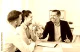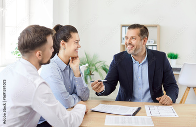 Happy professional realtor, lawyer, financial advisor consulting family couple clients in office, customers meeting broker bank worker, discussing agreement, making flat purchase, investment consult