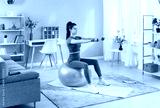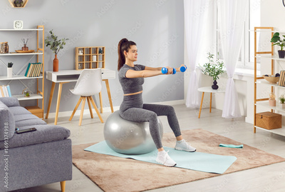 Cheerful young smiling sporty woman in gray sportswear doing exercise with dumbbells sitting on fit ball at home. Girl exercising indoors. Workout sport, fitness and home training concept.