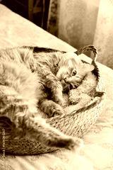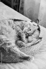 Cute ginger cat laing in his soft cozy round woven cat bed