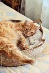 Cute ginger cat laing in his soft cozy round woven cat bed