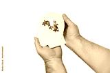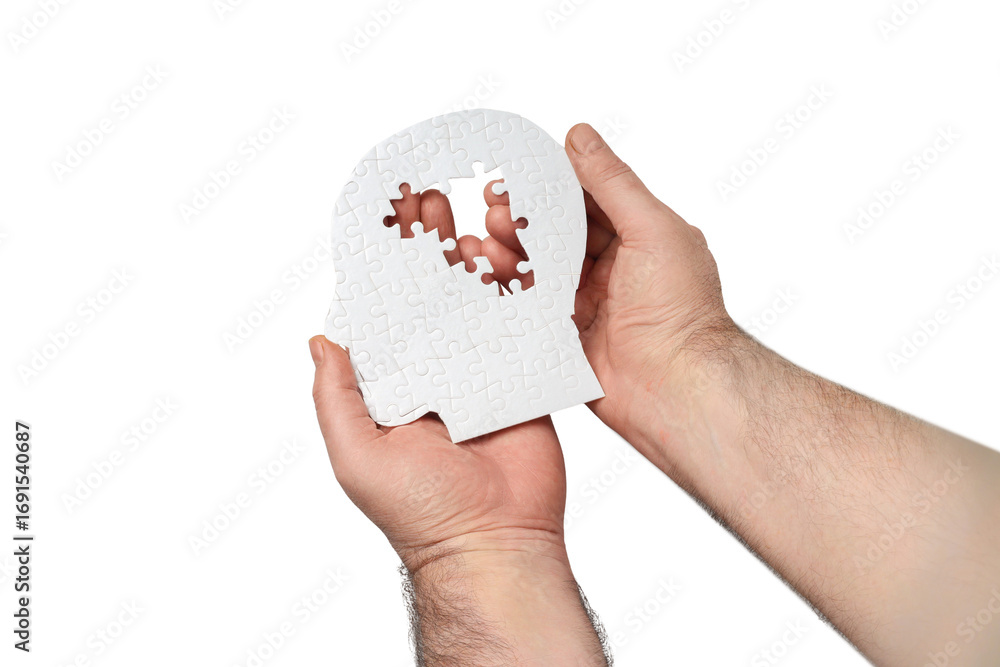 Hands hold a skull-shaped puzzle, isolated on white, PNG