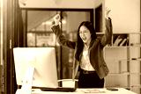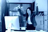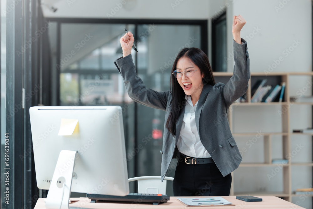 Asian businesswoman celebrating success, raising arms and holding pen, standing at desk with computer and documents in modern office