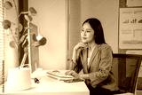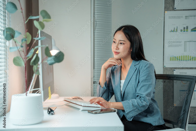 Confident young Asia businesswoman sitting at her workplace typing on desktop computer keyboard, working on financial and marketing projects in modern office