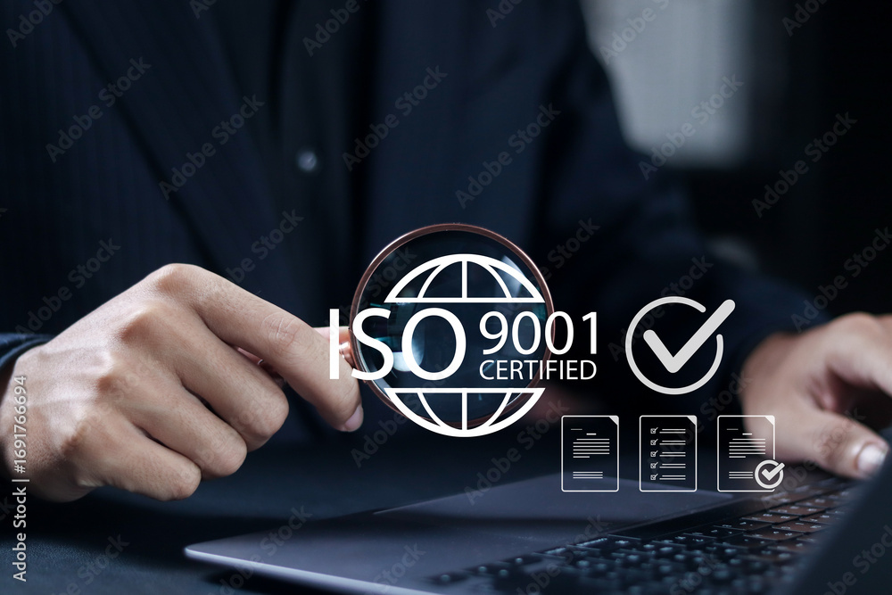 Quality control and ISO 9001 certification concept. Businessman using laptop with ISO 9001 certified icons on for quality management of organizations.
