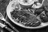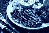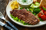Grilled beef steak with tzatziki sauce, pita bread and fresh vegetables on wooden table