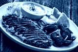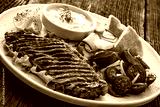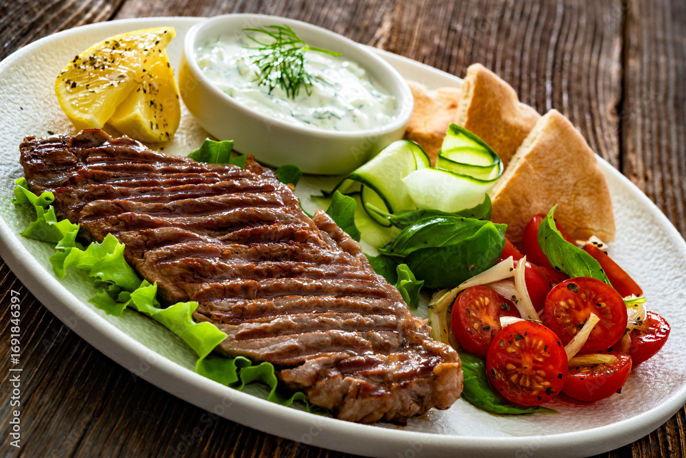 Grilled beef steak with tzatziki sauce, pita bread and fresh vegetables on wooden table