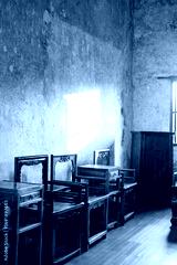 Close up old wooden cabinet and chair furniture of Chinese style in vintage and rustic grunge concrete wall in literature room with natural sunlight in Bangkok of Thailand. Vertical Photo