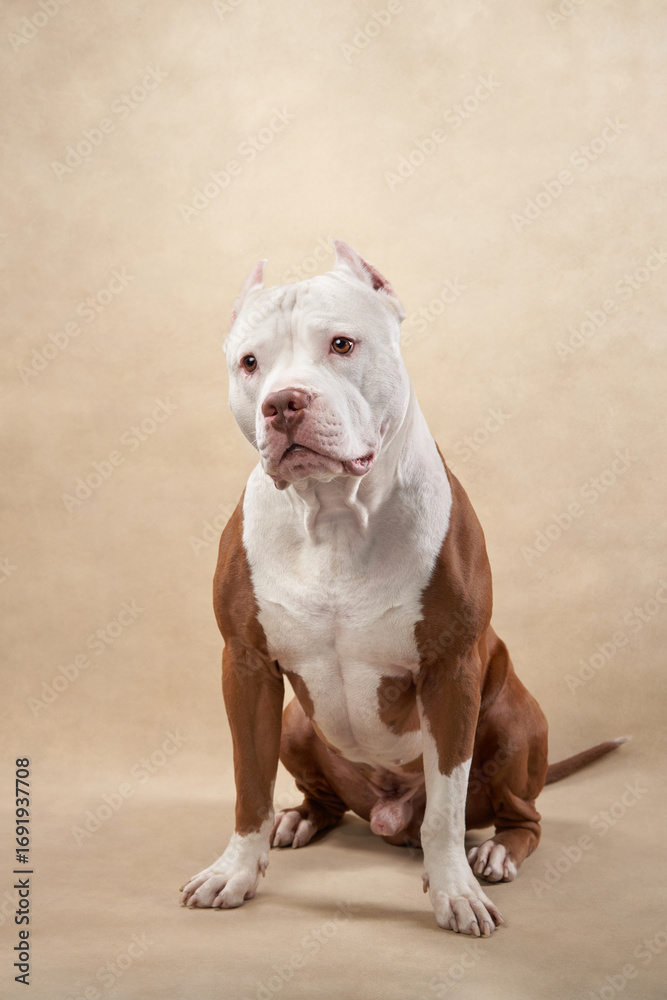 A Pitbull sits in a relaxed posture, gazing upward against a soft beige studio backdrop. The gentle pose emphasizes its attentive and calm expression.