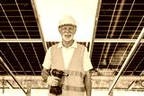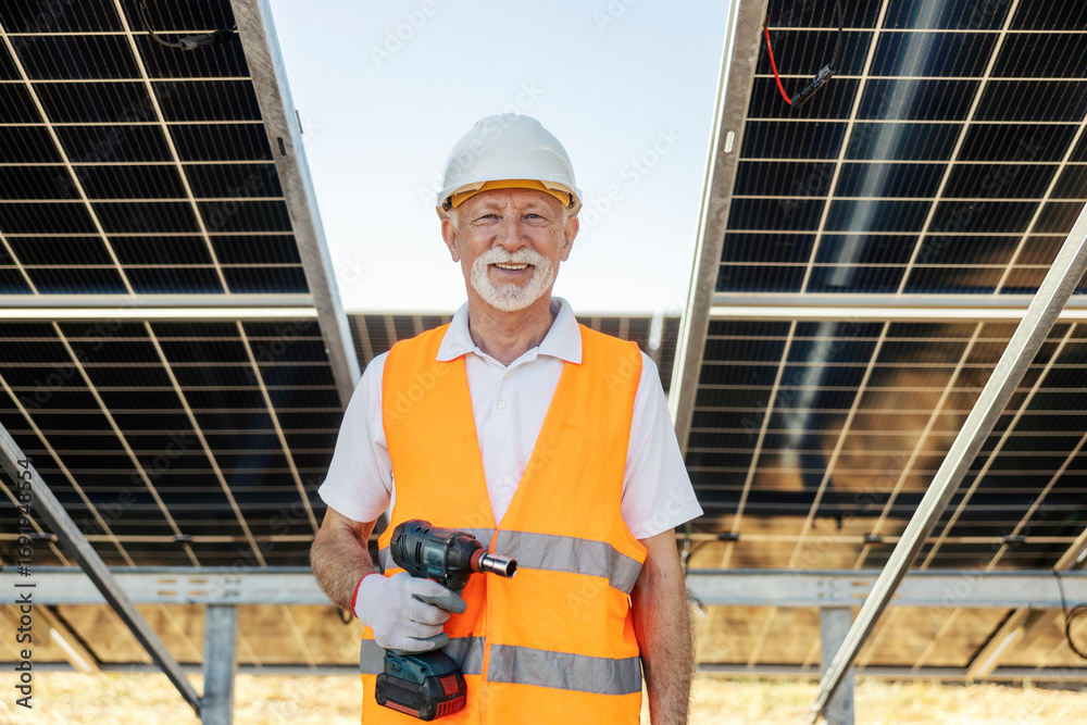Portrait of cheerful blue collar worker standing with drill near solar panels.