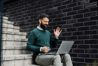 Friendly elegant businessman sitting on staircase with laptop and waving at it during conference call.
