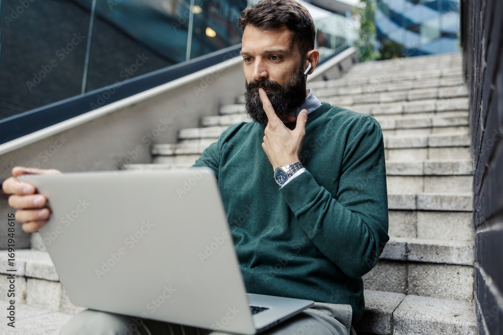 Portrait of a pensive businessman sitting on staircase with laptop in his lap at financial district.