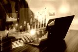 Modern businessman working on laptop with digital graphs and charts showing business growth forecast, investment strategy, and financial planning success.