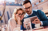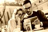 Young couple having fun with tablet. Dating, relationships, love, romance, lifestyle, technology