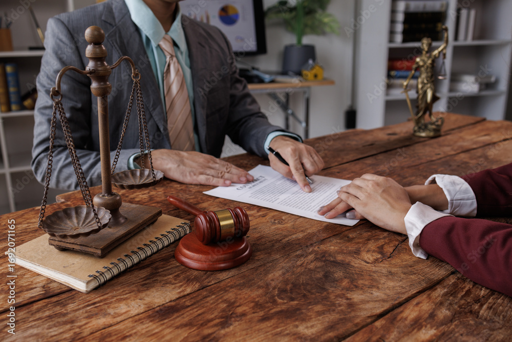 Judge gavel with Justice lawyers having team meeting at law firm in background. Concepts of law justice and lawyer Business partnership meeting concept.