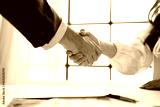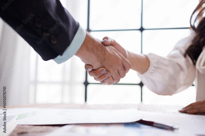 handshake business, Happy businesswoman shaking hand with businessman after interview at office