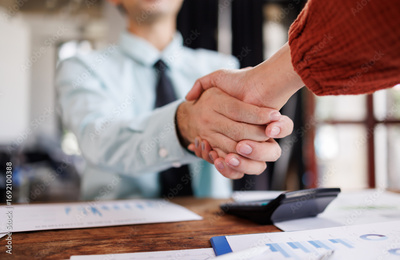 Business handshake in the office, Business partnership concept. Cropped image of two businessmen handshake.