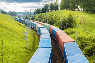Railway container transportation . Two freight trains with containers are traveling in parallel among green hills in nature in a beautiful place.