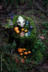 animal skull, gemstones and mushrooms in forest, dark nature background. symbol of death, terrible, scary. Samhain, Halloween. mystery fairytale atmosphere, witchcraft, magic crystal ritual. top view