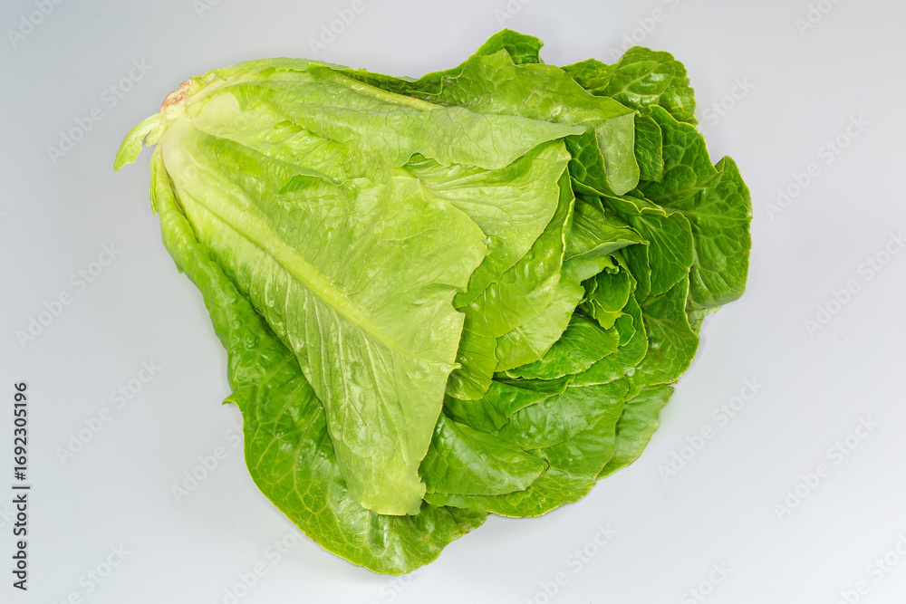 Head of green romaine lettuce on a gray surface