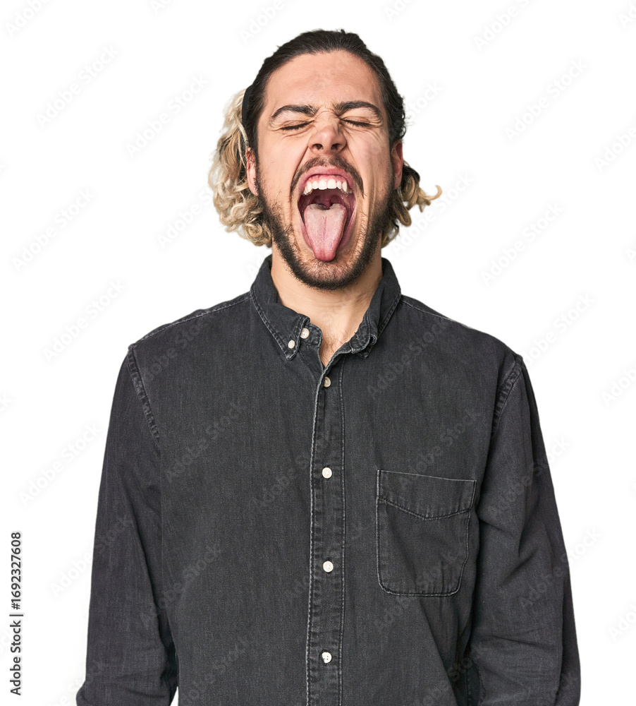 Young Caucasian man in studio setting funny and friendly sticking out tongue.