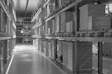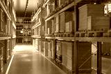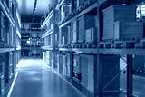 Logistics, Warehouse, Storage, Distribution. Industrial warehouse interior with stacked wooden crates, pallets, and containers on steel racks for cargo handling, supply chain operations,