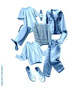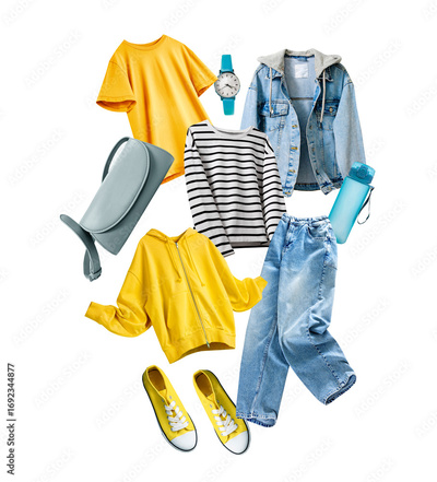 Denim sport casual clothes collage, trendy outfit. Young style female look. Women's clothing.Girl's apparel collection.Object