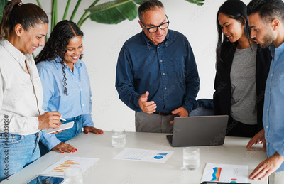 Multigenerational business people sharing ideas inside company office - Multiracial colleagues discussing new financial project - Brainstorming and corporate concept - Main focus on center man face