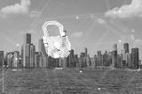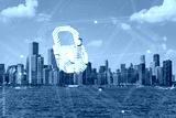 Chicago cityscape with digital hologram of a fingerprint overlay, conceptualizing future technology and security. Double exposure