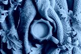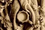 Mug of coffee latte, knitted woolen light beige sweater or plaid and dry oak leaves. Autumn, fall concept. Flat lay autumn composition.