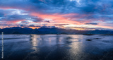 Empty wet asphalt road and majestic mountain silhouette with dramatic sky cloud at sunset
