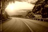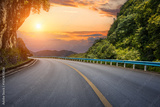 Winding asphalt road curves through a scenic mountain pass with lush green forest at sunset