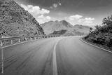 Winding asphalt highway curves through a majestic mountain landscape with green hills under blue sky