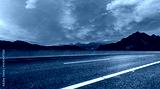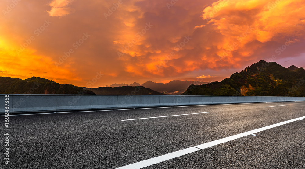 Empty asphalt highway road and mountain landscape with dramatic sky clouds at sunset