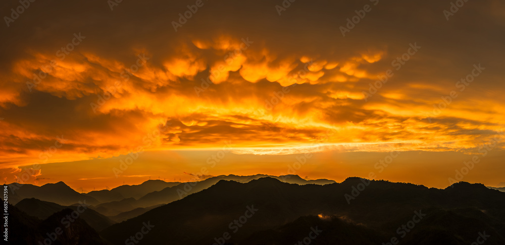 Panoramic view of a mountain range silhouette with dramatic fiery mammatus clouds at a golden sunset