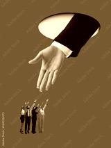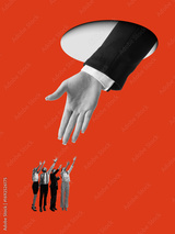 Bold colorful poster. Giant helping hand reaching down to business people on red background. Concept of leadership, teamwork, guidance, mentorship, corporate support, and emotional trust.