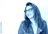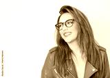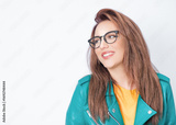 Happy young woman looking to side, wearing green leather jacket, isolated on white background. Pretty girl