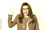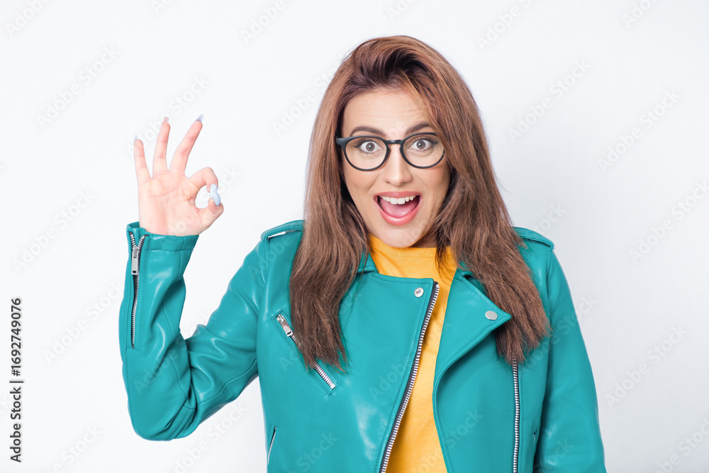 Surprised young woman shows excellent sign with finger, wearing green leather jacket, isolated on white background. Yes or excellent gesturing, body language concept