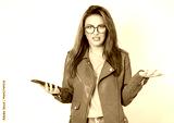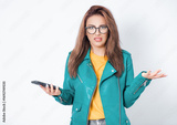 Confused cute woman holding the phone, wearing green leather jacket, isolated on white background. Female person with smartphone. Nuisance concept