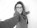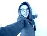 Selfie. Close up pleased beautiful girl takes photo of himself with her smartphone, wearing green leather jacket, isolated on white background. Focus on face