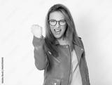 Angry girl looking at camera and shows fist, wearing green leather jacket, isolated on white background. Frustrated woman
