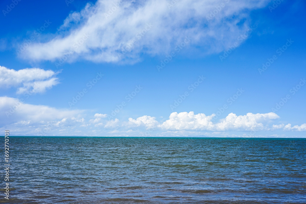 Qinghai lake water surface reflects blue sky and white clouds under bright daylight.