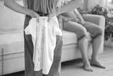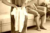 The child stained his clothes with ice cream. The girl hides a dirty T-shirt behind her back. The child is afraid of the parent.