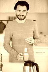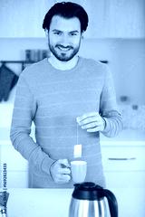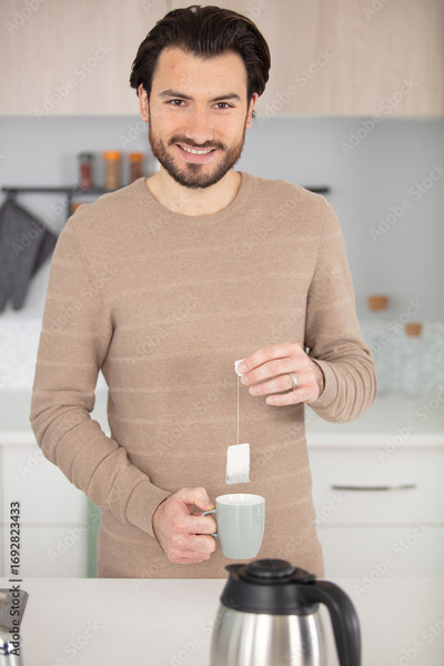 man holding teabag over a cup