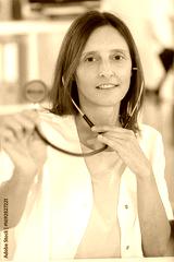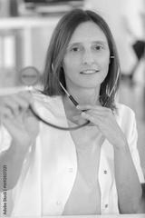 woman doctor with stethoscope looking at camera