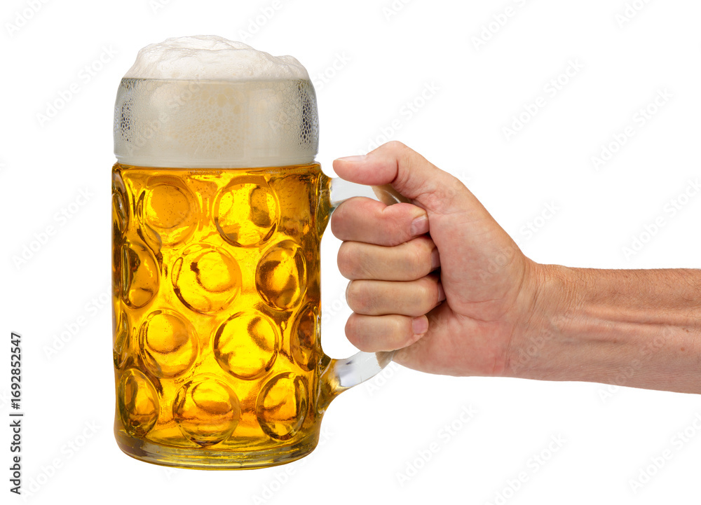 Ein Maßkrug gefüllt mit Bier auf dem Oktoberfest in München, isoliert vor weißem Hintergrund als Freisteller und Symbolbild - digital bearbeitet