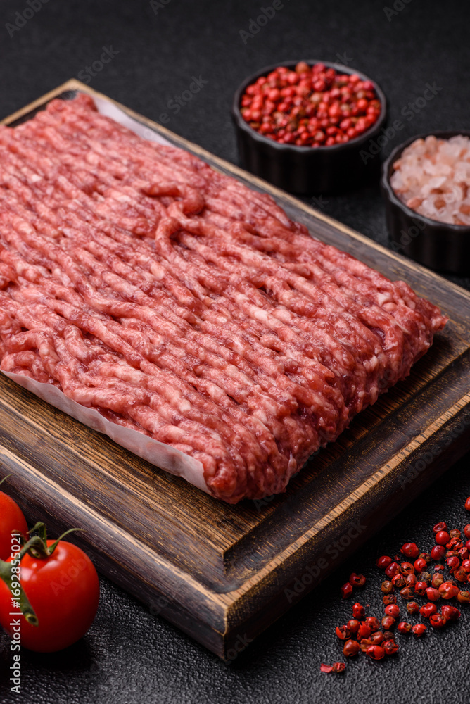 Raw ground beef or pork, fresh meat for burgers or other dishes. Raw beef minced meat