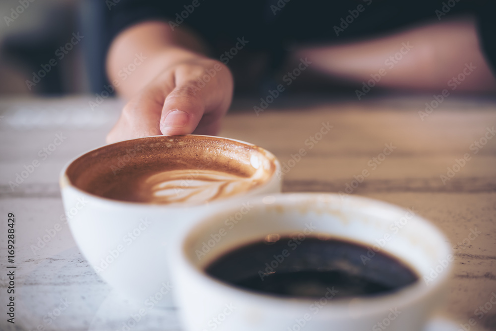 Close up image of two people clink white coffee mugs on wooden table in cafe