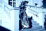 Elegant woman in zebra print maxi dress posing on luxury stone stairs outdoors in summer, fashion model wearing sunglasses and stylish dress