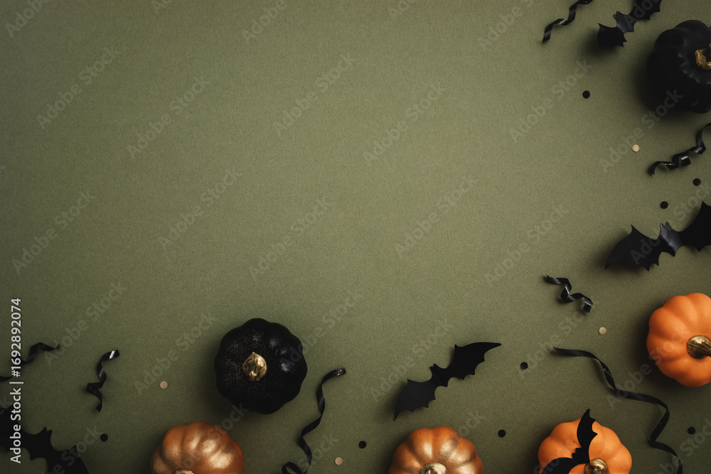 Halloween party background from orange and black pumpkins, bats on dark green table top view. Happy halloween holiday greeting card, flat lay.