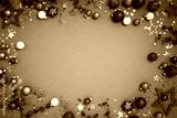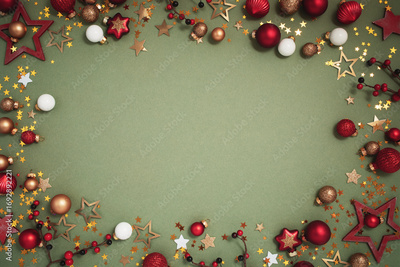 Christmas and New Year holiday background from festive decoration top view. Xmas ornament composition for greeting card.